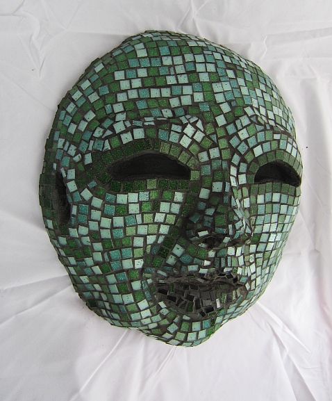 Nearly there: five shades of green vitreous 10mm tiles, colours are randomly placed except around the eyes, and black around the mouth etc. Just waiting for the grout to dry a little before final clean up.