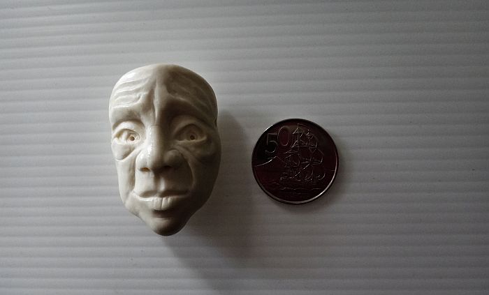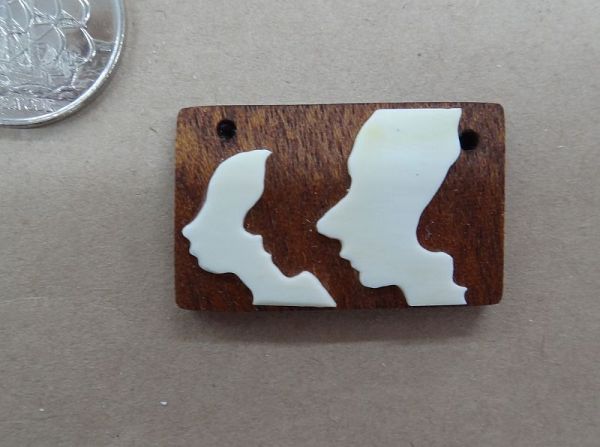 recycled ivory from old piano keys and upcycled mahogany from an old fruit platterNetsuke-style carving in the shape of an old-man mask