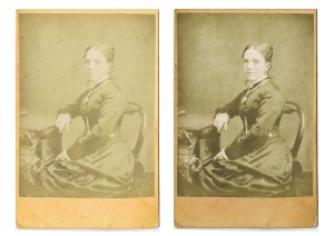 One challenge of using all those wonderful Photoshop tools is balancing cleaning up with losing the original texture – I’m want my result to still look old, with the character preserved, but with details of hair and clothing revealed.