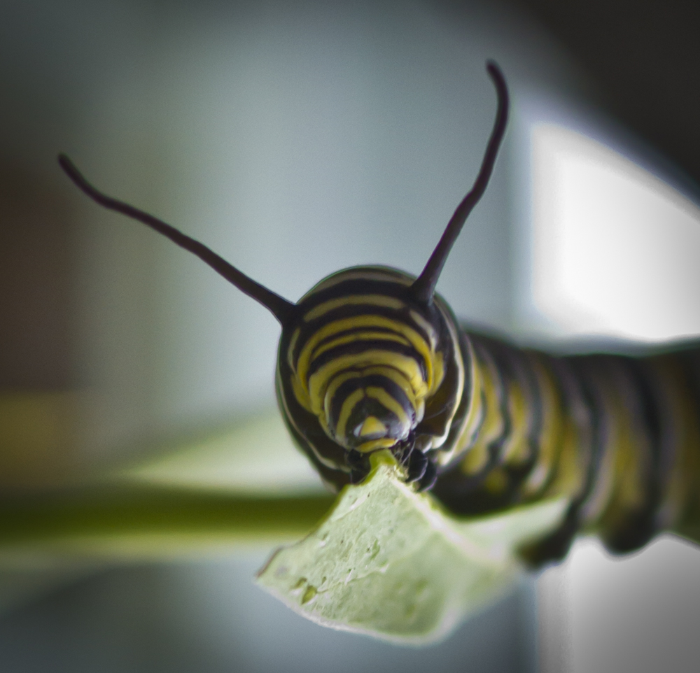 Monarch caterpillar eating March 17, 2013 Return to: Happy monarchs-to-beFull resolution (1000 × 962) Image navigation Previous Image Danaus plexippus, monarch butterfly caterpillar eating