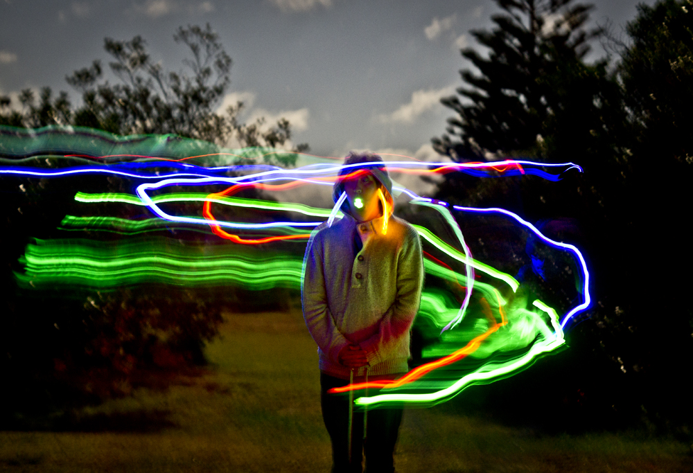 These are a few examples I managed to snap between explaining the cameras’ m button to people. Most of are 8-15 second exposures, and made using cheap coloured finger led lights and glow bracelets from the $2 Shop, some <$10 laser pointers, and (for the multiple exposure ones) with an old flash unit – by pressing the “test fire” button two or three times per photo.