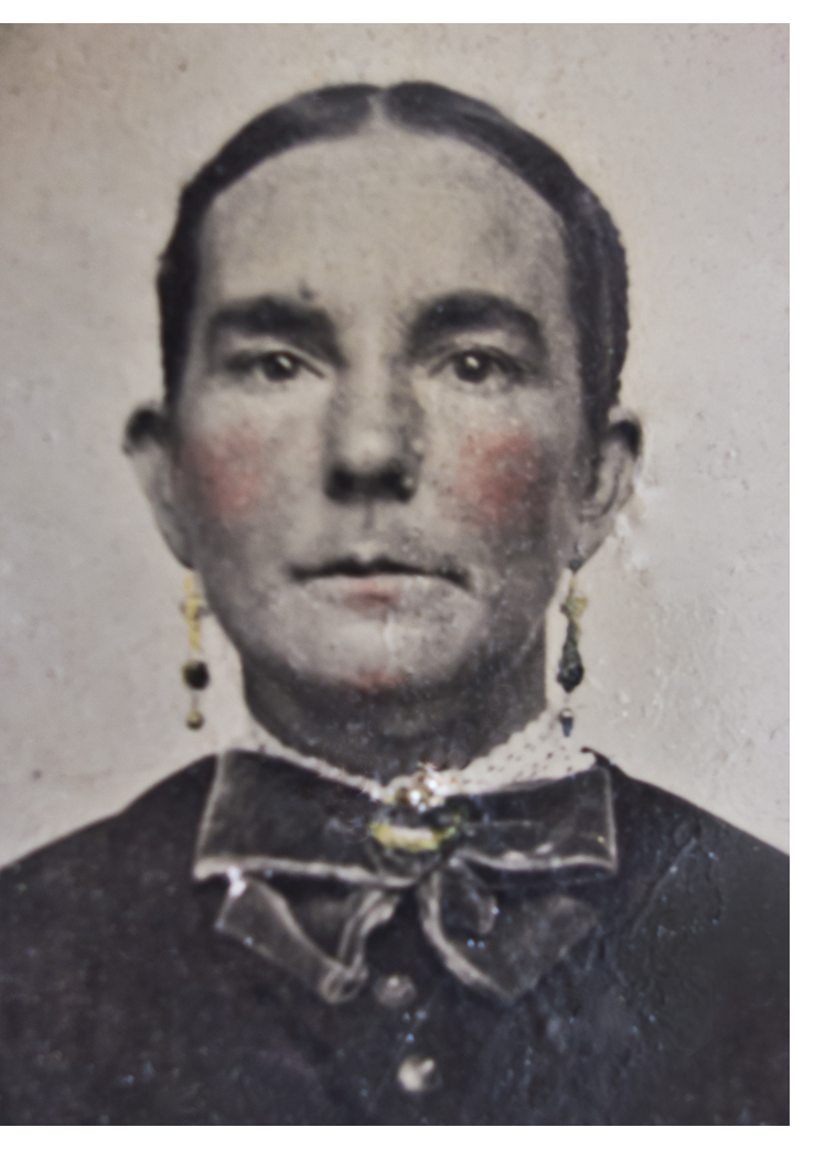 This tiny tintype is, according to the back, Miss Amanda Fish. She would probably not have been a dazzling beauty even in her own time, but she has made a heroic effort to present herself to best advantage, wearing elaborate earrings, a velvet bow with a brooch, and a top with fancy shiny buttons.