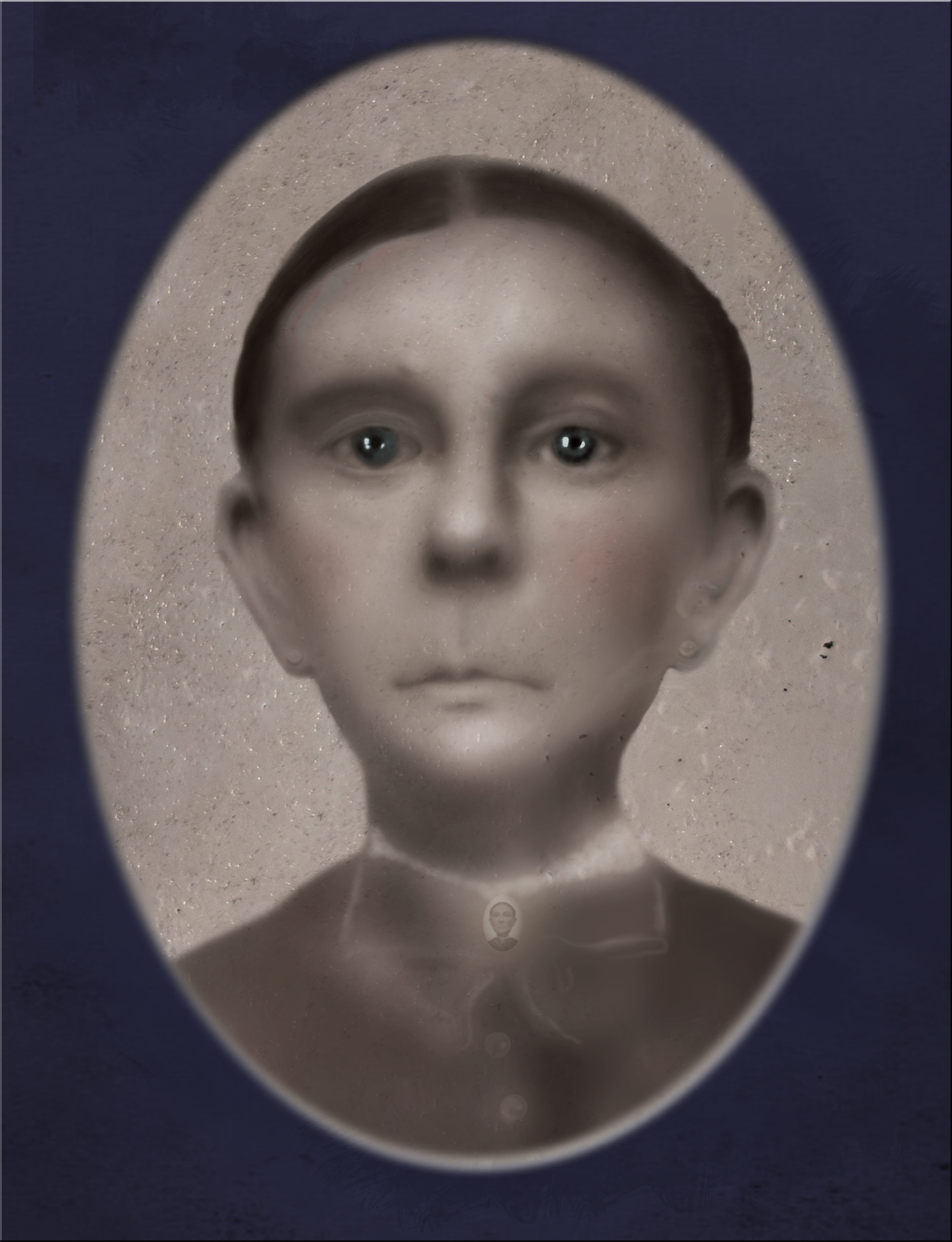 Not nearly finished, but well underway- Presenting Miss Fish. Based on this lovely tintype photo from the 1880s. The tiny original is, in the manner of its time, Photoshopped, with the eyes retouched, and colour added to her cheeks and earrings. This one, painted using my trusty Wacom Intuos 4.
