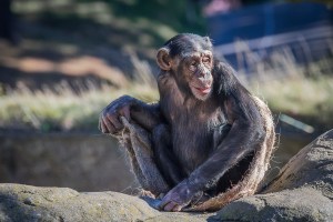 Sitting on the next tier of rock down from the little one playing with the sack, this older chimp seemed remarkably tolerant of the slow rain of floating straw from above.