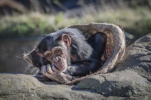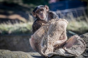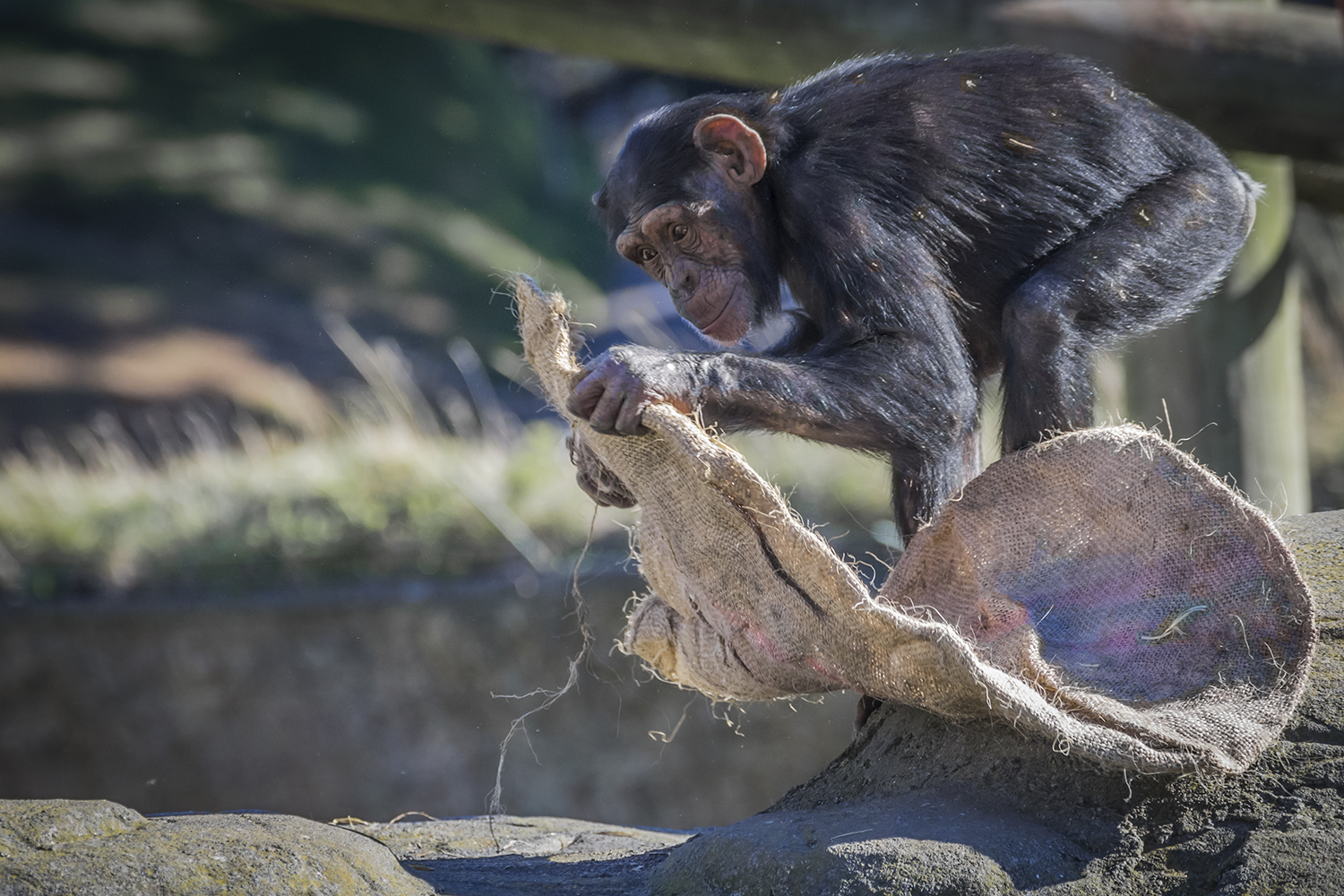 I find the troupe of chimps at the small zoo near my house fascinating – their beautiful faces, their mostly affectionate but sometimes stroppy interactions, their energy and interest in whatever is happening around them. Playing in the sunshine on a rare perfect mid-winter day, this youngling found much entertainment in a piece of sacking. All that could be done with it in terms of wrapping up and waving around (scattering clouds of straw bedding) was explored, with occasionally stops to stare intently at an edge or some detail of texture.