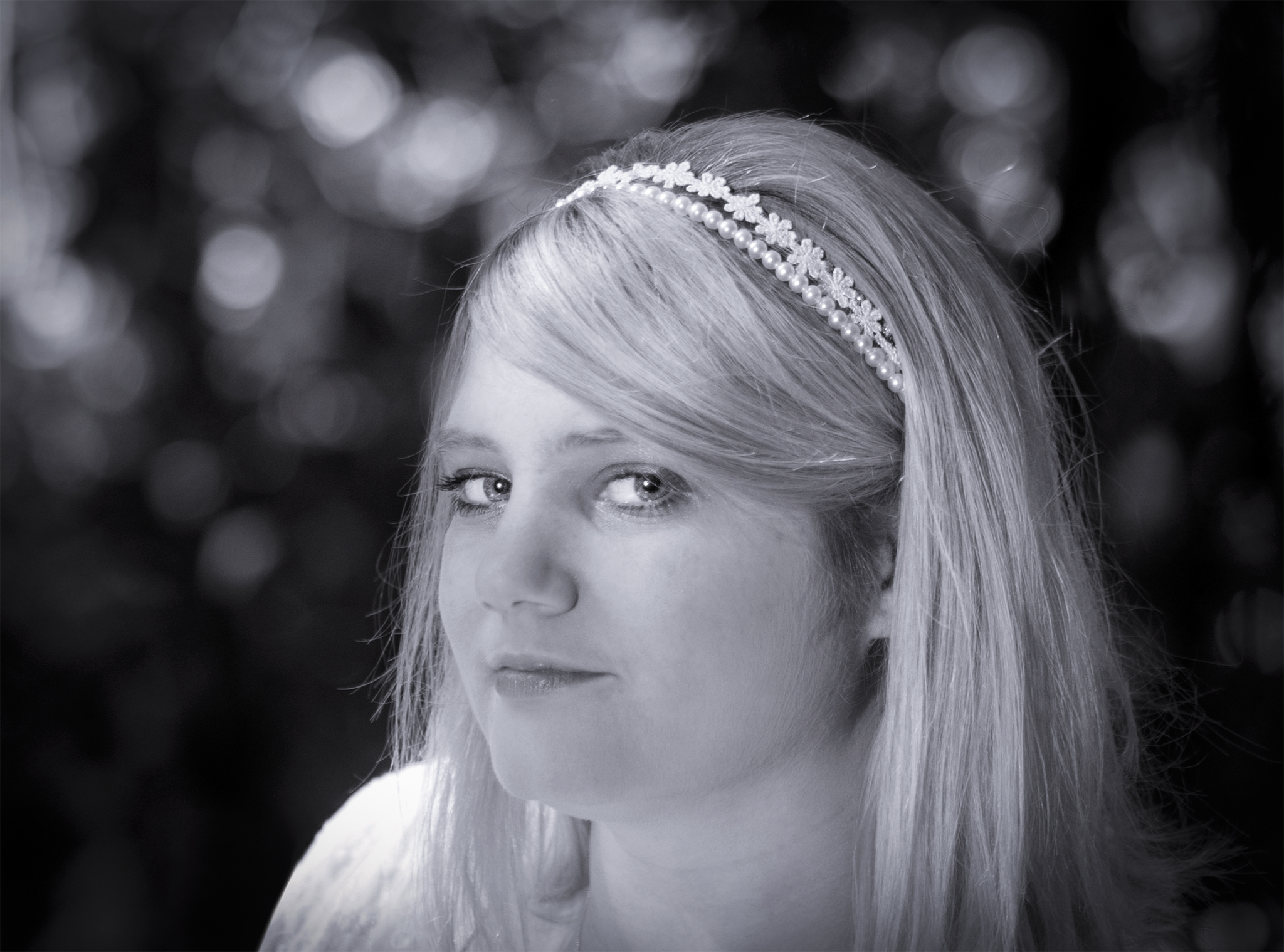 Taken at noon, in light filtered by leaves being whipped around in a brisk breeze, with very erratic brightness. Settings: 55mm f/2 iso 100 1/200, and me holding a flash (with a remote trigger on camera) as far away as I could with one hand, while balancing and focusing the camera with the other.
