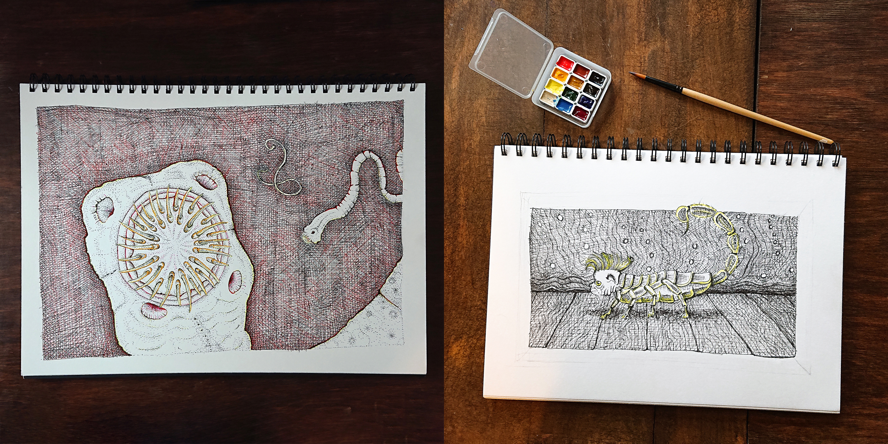 More fineliner cross hatching whimsy. First trying to understand tapeworm body structure by drawing out some of the weirdness. For example, they have no eating parts, just attachment hooks and suckers on their head – nourishment is absorbed through the skin. Then, just playing with monsters, your standard dog-headed scorpion. I probably shouldn’t have done a back wall and a floor, clearly way too much.