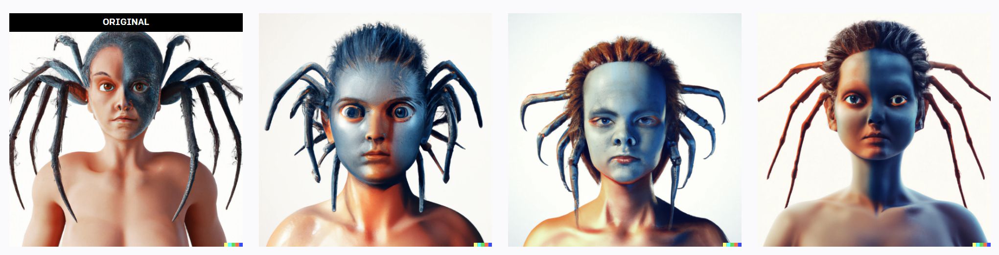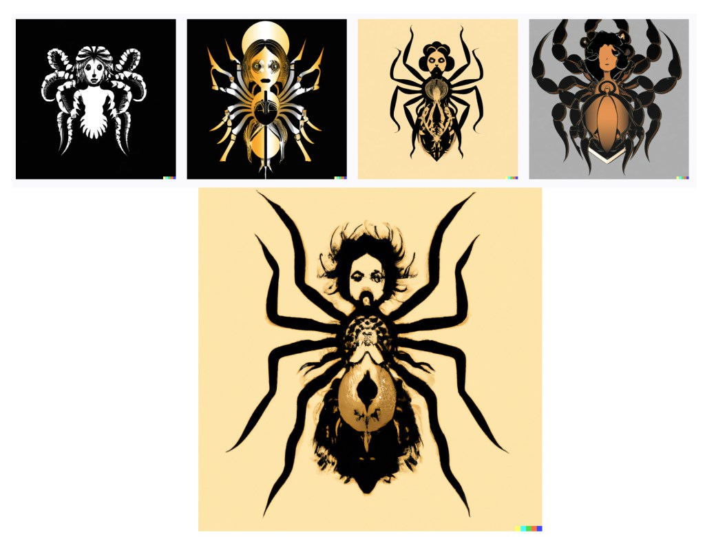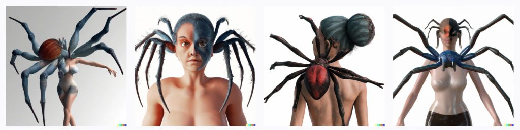 Beginner effort : My ask-for in this eg was “creature that is half woman half spider, 3D render, hyper real”. The results … were not what I was expecting.