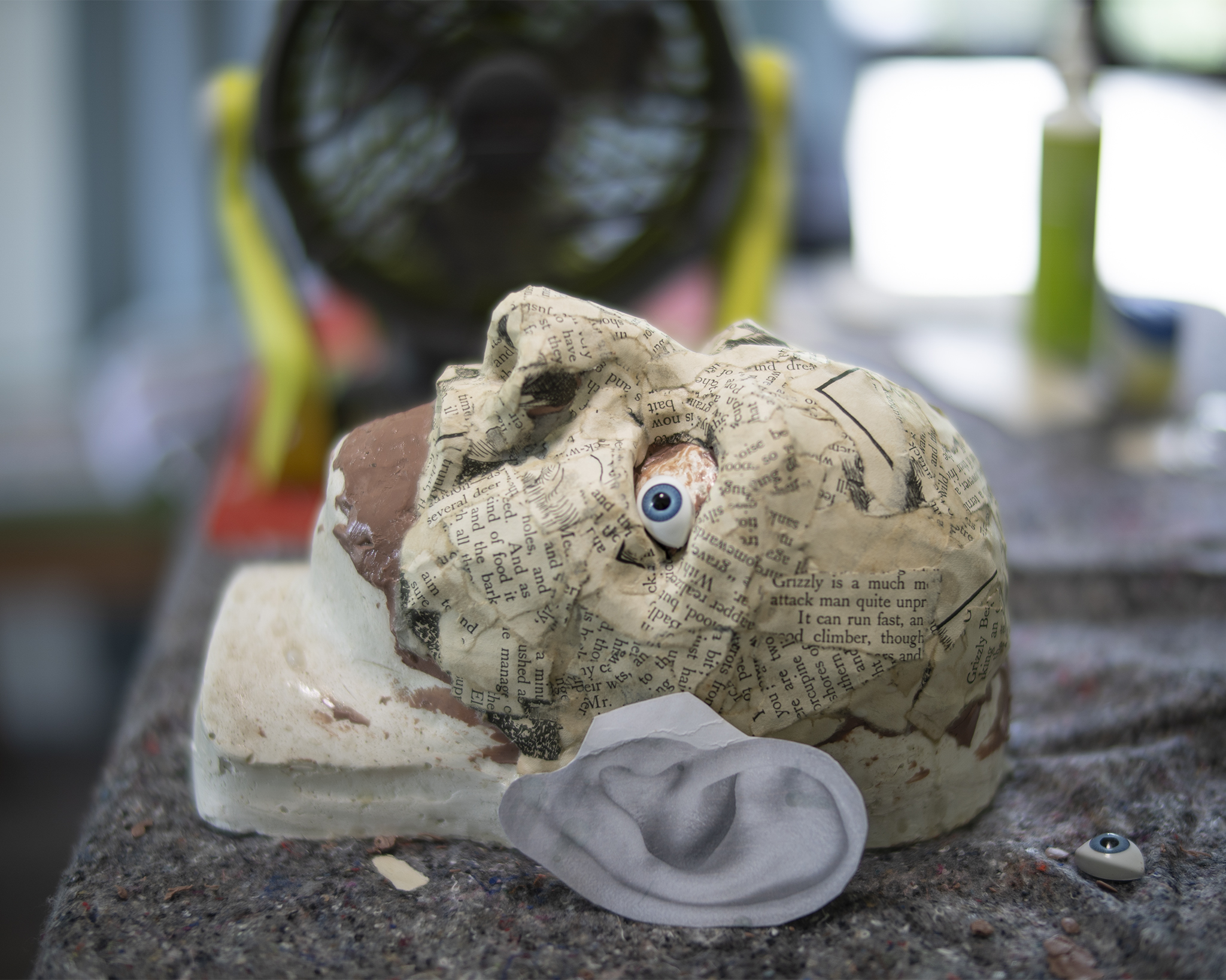With layer 2 of old book mâché now drying, it is time to size up subtle details like ears and eyes, before adding another five or six layers over the next few days. I feel this chap should also have false teeth, or maybe a mustache? It’ll be a half mask, so the accessory parts needs to be able to be spoken around, as well as offering a performer good vision.