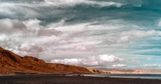 Dramatic clouds over orange tinted hills, dark sand and the sea. 720nm IR filter