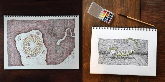 Crosshatched ink sketches of a tapeworm and a dog-scorpion